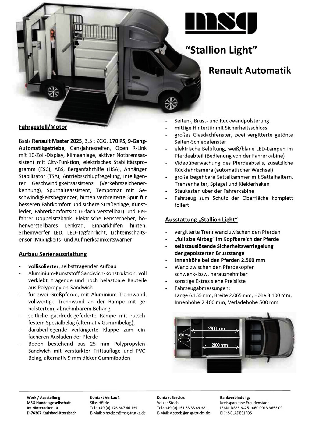 Die Standlänge im Pferdeabteil des Transporters wurde auf 271 cm verlängert. Alle „stallion light“ Modelle werden seit 2022 mit dem „safety concept“ ausgestattet. Mit Kopfairbags für die Pferde und selbst entriegelnden patentierten Bruststangen - denn wer würde sich heute noch ein Auto ohne Airbags und Sicherheitsgurt kaufen. Die Bruststange hat bei Unfällen oder unruhigem Fahren die Wirkung wie ein Sicherheitsgurt und fixiert das Pferd, dass es nicht fällt und sich verletzt. Nachteil einer gewöhnlichen, festen Bruststange ist, dass manche Pferde in Paniksituationen oder einfach aus Langeweile „über die Stange springen“ und dann festhängen. Um derartige Unfälle zu verhindern, arbeitet die patentierte MSG-Bruststange automatisch selbst entriegelnd. Das bedeutet, dass der Brustriegel nur bei erhöhter Belastung direkt von oben selbsttätig nach unten wegklappt. Das Pferd steht bereits Sekundenbruchteile nach dem Überspringen der Bruststange wieder sicher auf den Vorderbeinen und die Bruststange kann einfach wieder eingehängt werden. Der Raum für die Pferde verfügt über ergonomische Polsterung zum Schutz der Pferde sowie an allen nach innen stehenden Bauteilen über maximale Radien. So sind die Pferde auch in extremen Fahrsituationen geschützt.
